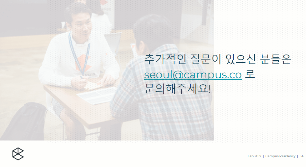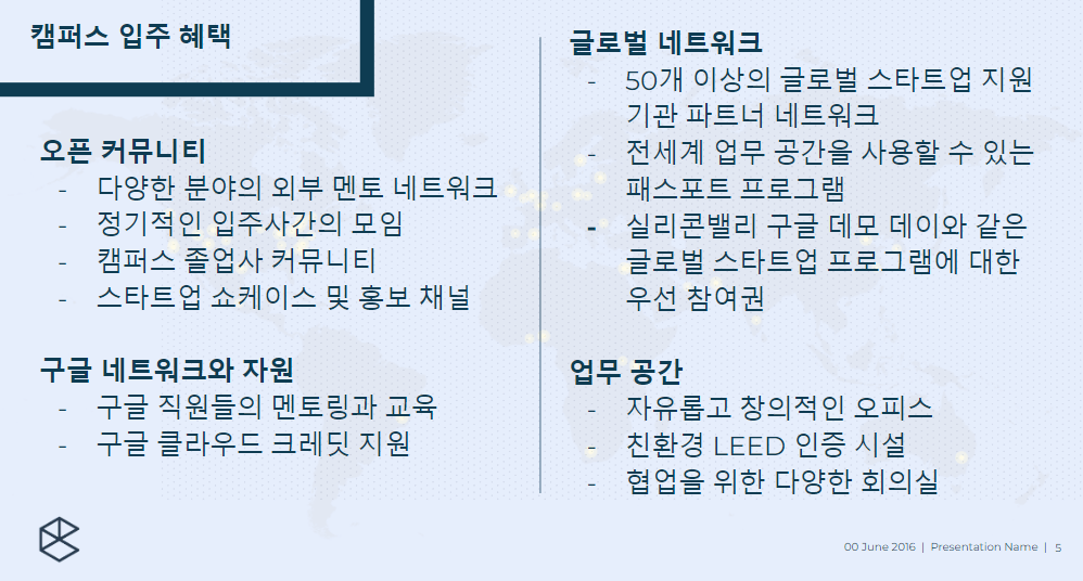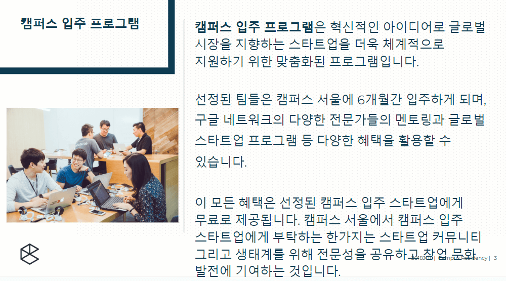 무료로 사무실 공간을 얻는 것보다 구글 전문가들의 멘토링을 무료로 받는다는 것이 어찌 보면 더욱 특화된 서비스를 제공받는 기회가 될 것이라 부디 이 좋은 기회를 놓치는 일이 없었으면 좋겠습니다.
