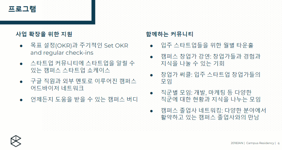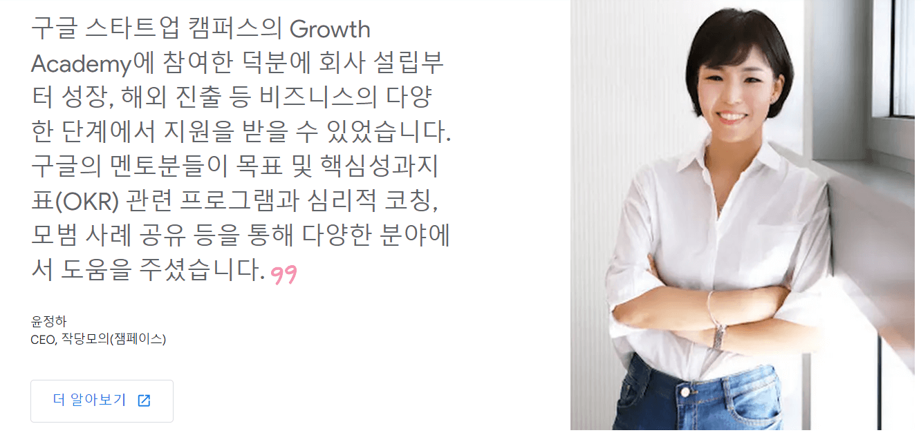 기존에 구글캠퍼스 서울에 입주하시어 도움을 받으셨던 분들의 인터뷰를 보자면 고려해 보지 않았던 마케팅 및 사업화 전략에 관한 도움을 받을 수 있어서 좋았고 캠퍼스 엑스퍼트 서밋 프로그램에서 구글 멘토와의 미팅을 통해 제품을 새로운 시각으로 볼 수 있어서 좋았다는 의견을 말씀하셨습니다.