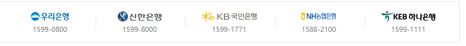 우리은행, 신한은행, KB국민은행, NH농협은행, KEB하나은행이 있습니다. 필요하신 분은 꼭 한번씩 방문하시어 상담을 받아보시고 예산이 떨어지기 전에 확인하시기를 바랍니다.